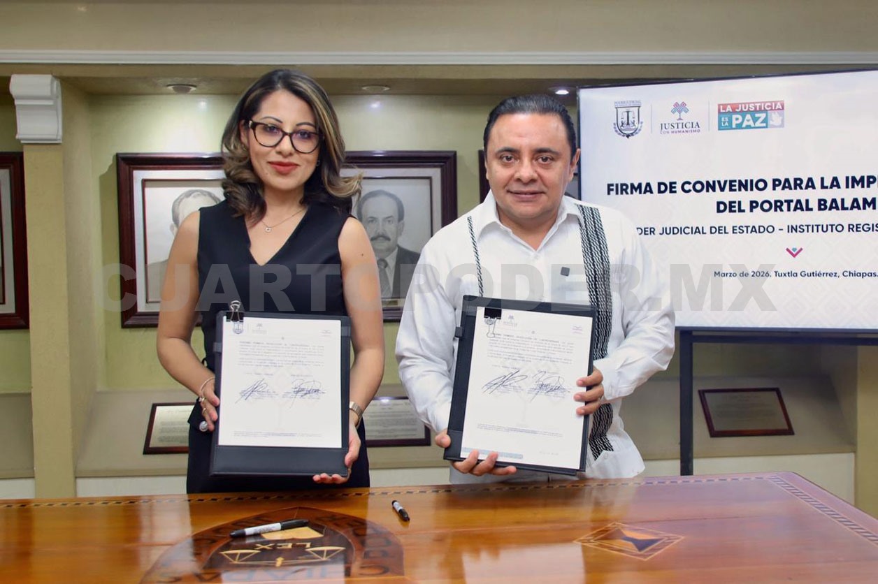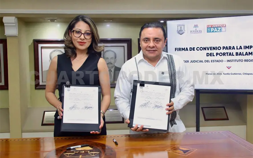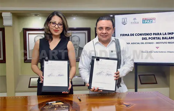 El magistrado presidente del Poder Judicial del Estado (PJE) de Chiapas, Juan Carlos Moreno Guillén, encabezó junto a la directora general del Instituto Registral del Estado, Adriana Mercedes Ramos Díaz, la firma de convenio de colaboración para la implementación del “Portal Balam”, una herramienta tecnológica orientada a fortalecer la interconexión institucional y agilizar los procesos judiciales.