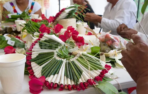 El proceso es ceremonial desde el inicio: hombres designados recolectan las flores, los espacios de trabajo son purificados, se comparte pozol y la música tradicional acompaña la confección.