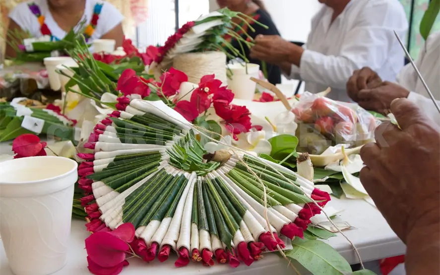 Con agujas largas y fibras naturales, los ramilleteros, a quienes hoy se suman también mujeres y jóvenes, cosen cada flor sobre una base de hojas de mango que puede tomar entre cuatro y ocho horas de trabajo.