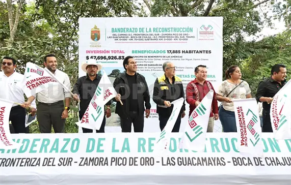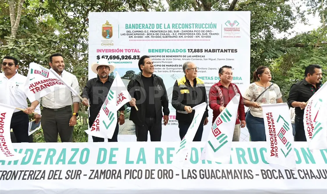 En el municipio de Benemérito de las Américas, el gobernador Eduardo Ramírez Aguilar dio inicio a los trabajos de reconstrucción del camino E.C. Fronteriza del Sur–Zamora Pico de Oro–Las Guacamayas–Boca de Chajul–E.C. Fronteriza del Sur, con una inversión superior a 67.6 millones de pesos, en beneficio de más de 17 mil habitantes de diversas localidades. En este marco, destacó que su administración trabaja de manera permanente y comprometida en la rehabilitación y mejora de todos los tramos carreteros estatales.