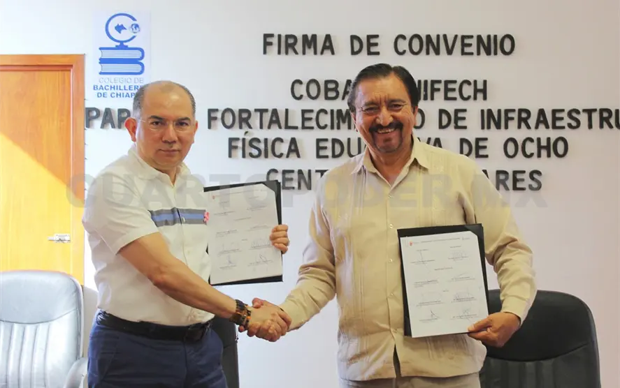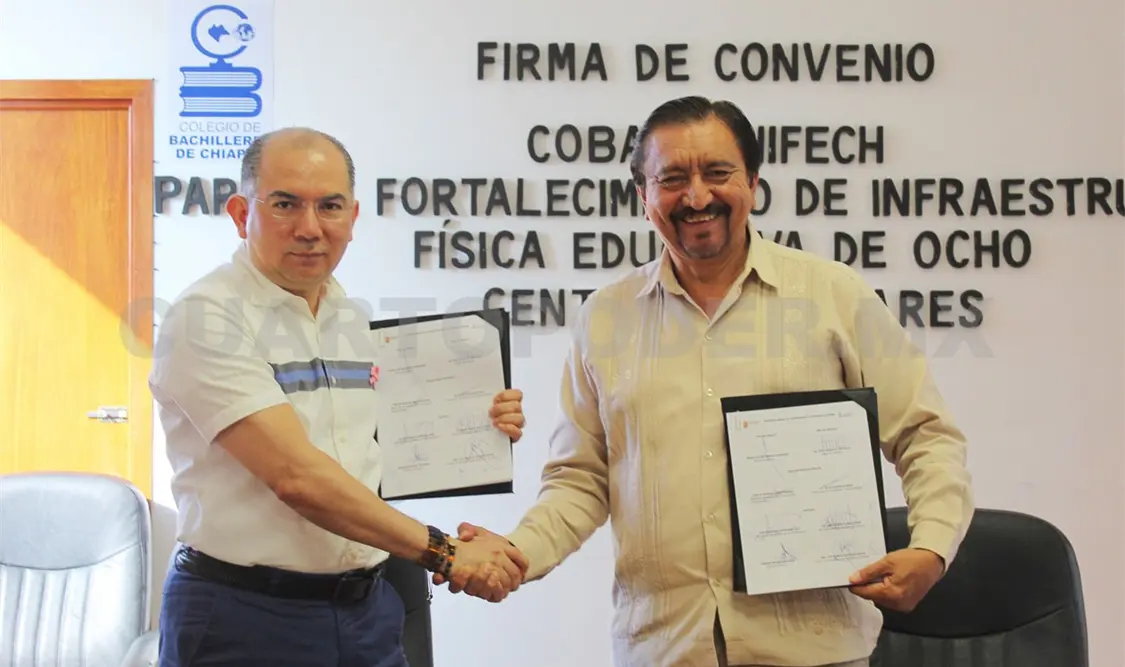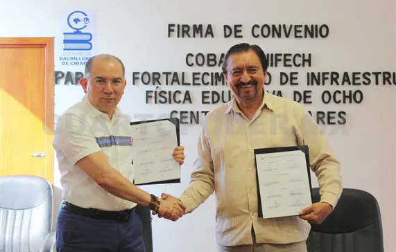 Como parte de las acciones de colaboración interinstitucional, el titular del Instituto de la Infraestructura Física Educativa del Estado de Chiapas (Inifech), Enoc Gordillo Argüello, y el director general del Colegio de Bachilleres de Chiapas (Cobach), Jorge Luis Escandón Hernández, suscribieron convenios para la atención de ocho planteles escolares de este subsistema educativo.