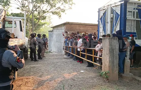 Al menos unas 80 personas ya esperaban a los efectivos policiacos y militares, impidiéndoles el paso en la entrada a esta localidad. Bajaron una ‘pluma’ de metal y atravesaron un camión tipo rabón.