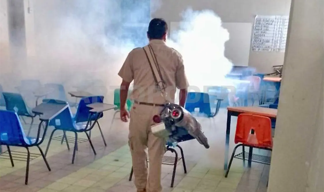 El reporte de las autoridades indica que en las últimas semanas se han incrementado en toda la región de la Costa, Soconusco y Frontera Sur, los casos de dengue, es por eso que se mantiene un operativo emergente; el plantel de educación media superior solicitó apoyo para nebulizar.