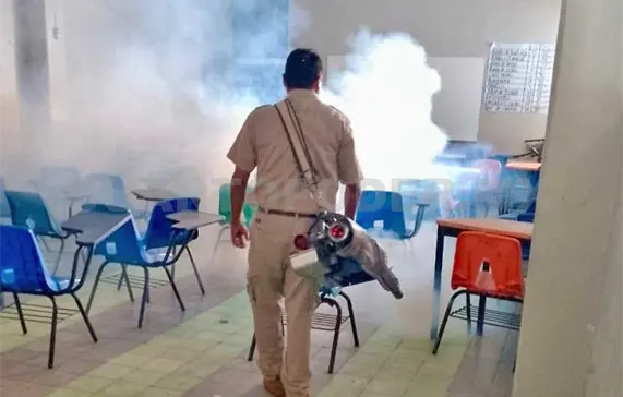Para prevenir contagios de enfermedades transmitidas por vectores (dengue, zika y chikungunya) entre la población estudiantil, personal del Distrito de Salud VII realizó una nebulización del edificio de la Escuela Preparatoria Tapachula.