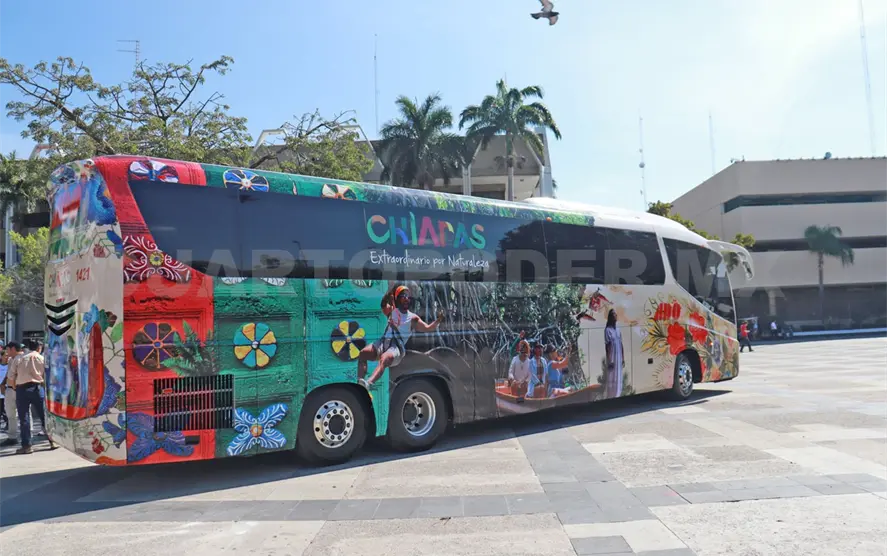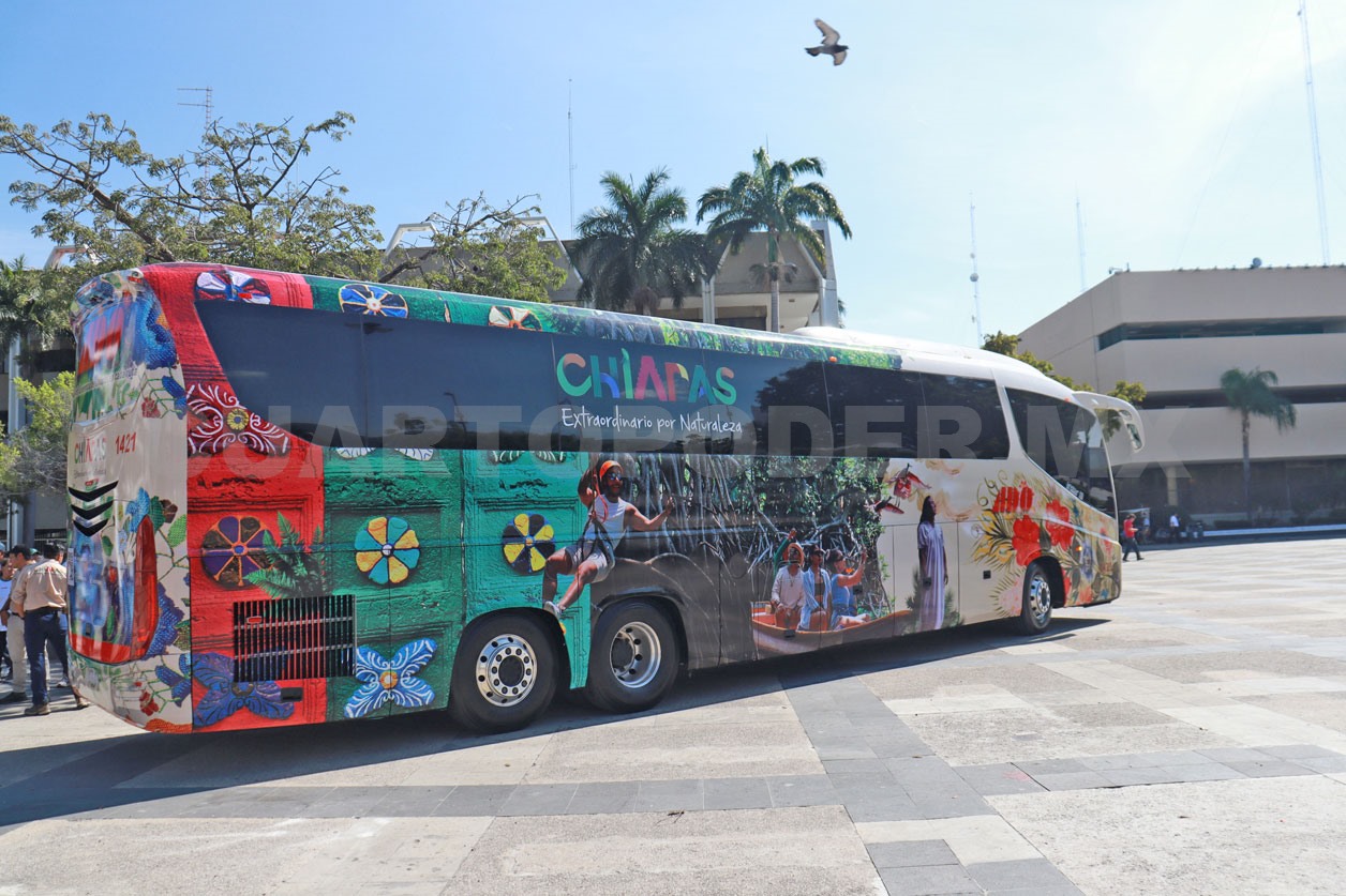 El autobús está forrado de diversos paisajes de Chiapas, destacando la selva, las guacamayas y el turismo de naturaleza. Lo que se busca es que las personas vean más la imagen de la entidad y les genere interés de visitarla.
