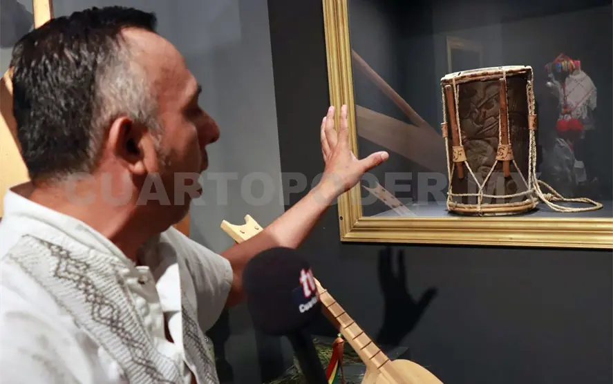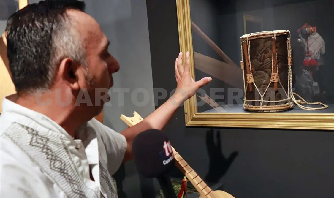 Su pieza implicó un trabajo de 15 días, y le acompañan elementos de madera, así como cuero de borrego. Los detalles que tiene incrustado, relató el artesano, indican que ese tambor ameniza el baile del Tigre y hasta del Venadito.