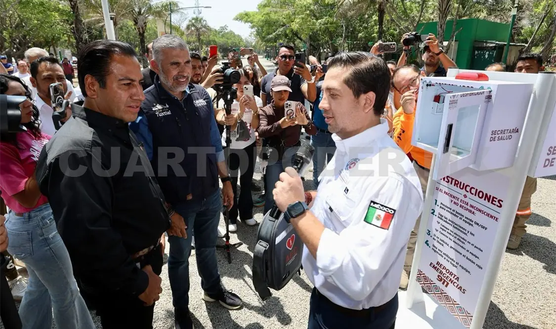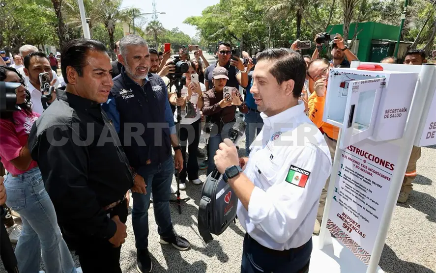 Detalló que se han colocado tres desfibriladores en los tótems distribuidos en el parque, y uno más dentro del consultorio de primer contacto. Todos los dispositivos ya se encuentran en funcionamiento para garantizar mayor seguridad a las y los usuarios del espacio recreativo.