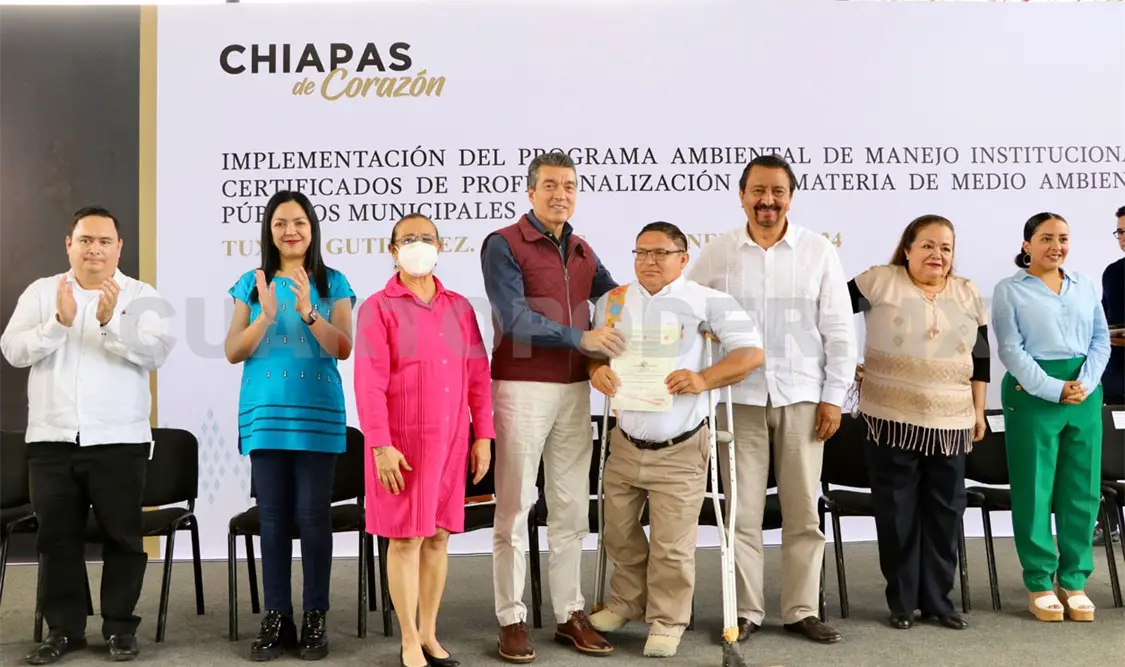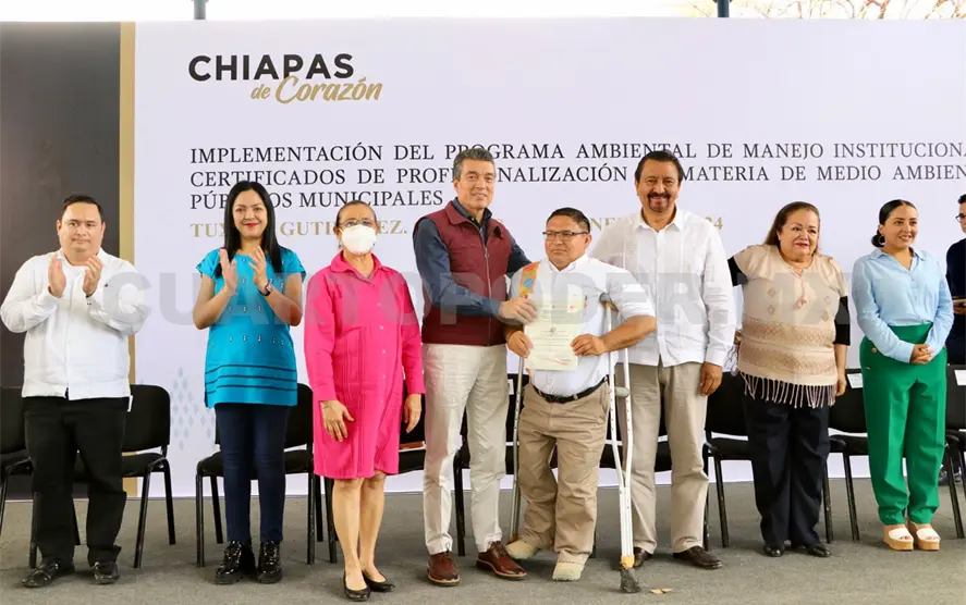 Al entregar certificados de profesionalización en materia de medio ambiente a servidoras y servidores públicos municipales, el gobernador Rutilio Escandón Cadenas destacó la importancia de implementar el Programa Ambiental de Manejo Institucional, que privilegia la participación del sector educativo y de instituciones públicas a fin de fortalecer la cultura ambiental, a través de la disminución y el manejo correcto de residuos sólidos.