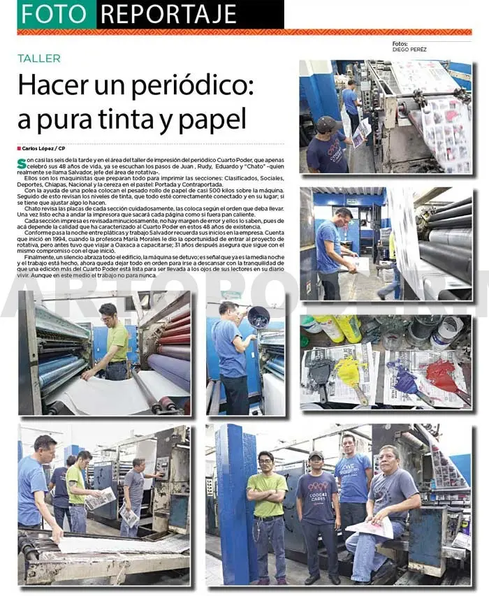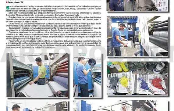 Son casi las seis de la tarde y en el área del taller de impresión del periódico Cuarto Poder, que apenas celebró sus 48 años de vida, ya se escuchan los pasos de Juan , Rudy, Eduardo y “Chato” -quien realmente se llama Salvador, jefe del área de rotativa-.
