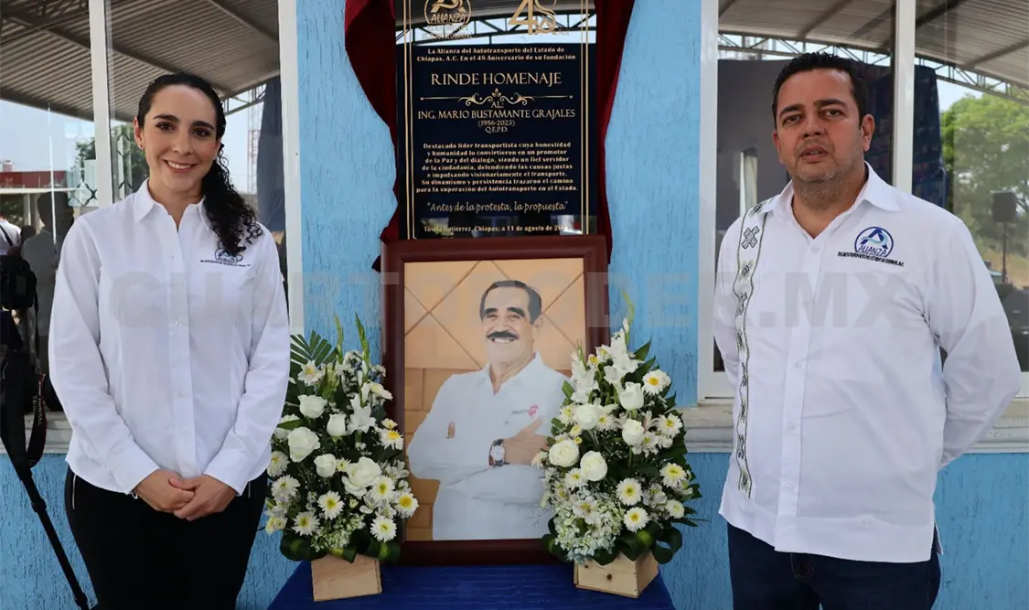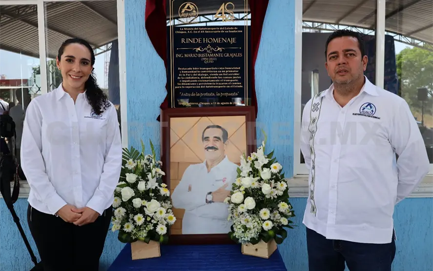 A un año de la partida física de este mundo, quienes conforman la Alianza del Autotransporte del Estado de Chiapas rindieron un homenaje a Mario Bustamante Grajales, quien fue un destacado líder del sector y presidente de dicha agrupación. Al evento acudió su hija, Mariana Bustamante Vidal.
