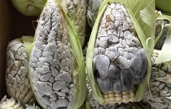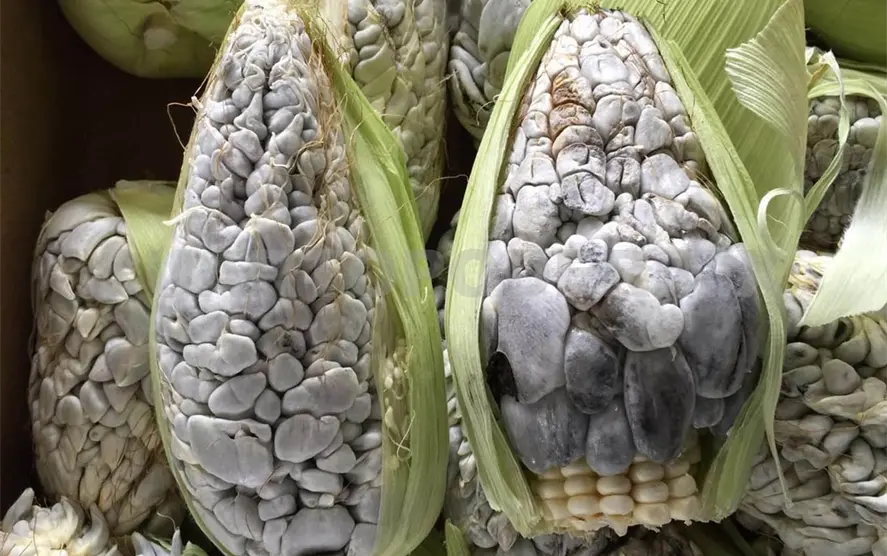 El huitlacoche forma agallas grisáceas en las mazorcas, sustituyendo los granos de maíz. Aunque en otras naciones se combate como plaga, en nuestro país se celebra; en la central de abasto de la Ciudad de México durante la temporada de lluvias (junio a noviembre) se comercializan tres toneladas y media diarias.