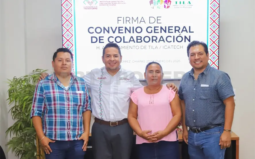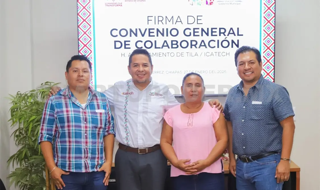 Con el objetivo de fortalecer la calidad de la gestión pública y promover acciones que beneficien directamente a la población chol, el Instituto de Capacitación y Vinculación Tecnológica del Estado de Chiapas (Icatech) signó un Convenio General de Colaboración Interinstitucional con el Ayuntamiento de Tila. Este acuerdo tiene como propósito unir esfuerzos para fomentar el desarrollo y bienestar de la sociedad del municipio.