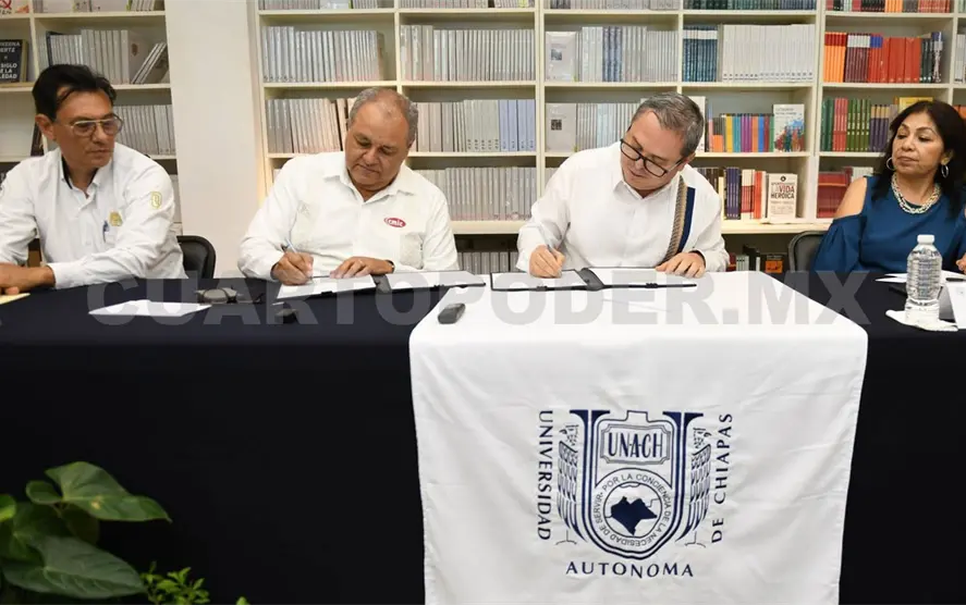 Ante integrantes de esta Cámara y de la comunidad universitaria, el rector Oswaldo Chacón Rojas y el presidente del Comité Directivo de la CMIC, Rogelio Tamayo Carboney, signaron este acuerdo en las instalaciones de la Librería del Fondo de Cultura Económica “José Emilio Pacheco”.