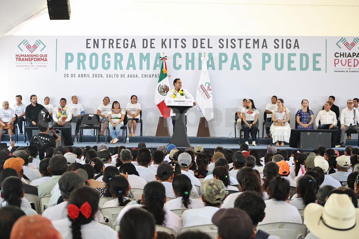 Durante una gira de trabajo por el municipio de Salto de Agua, el gobernador Eduardo Ramírez Aguilar encabezó la entrega de tres mil 700 kits del programa Chiapas Puede, donde afirmó que enseñar a leer y escribir constituye uno de los actos más humanos. En ese sentido, reconoció el compromiso y la suma de esfuerzos entre pueblo y gobierno para avanzar en la lucha contra la ignorancia.