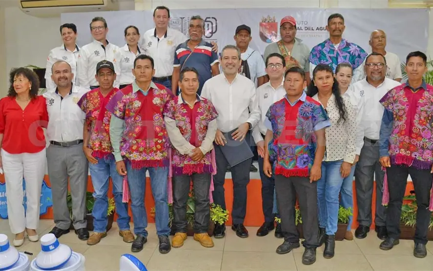 El rector de la Universidad Autónoma de Chiapas (Unach), Carlos Faustino Natarén Nandayapa y el director general del Instituto Estatal del Agua (Inesa), Fernando Adolfo Zepeda Soto, encabezaron la entrega de 70 filtros y 50 boyas dispersoras de cloro, con el objetivo de promover el cuidado y uso sustentable del vital líquido de distintas comunidades.