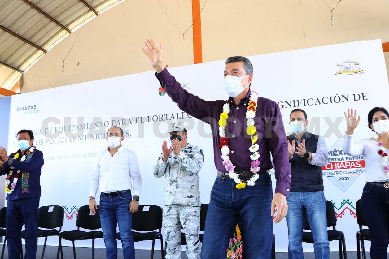Al inaugurar el mercado local y entregar una patrulla, uniformes y equipamiento para fortalecer la seguridad pública, en la localidad Nuevo Huixtán, municipio de Las Margaritas, el gobernador Rutilio Escandón Cadenas sostuvo que seguirá impulsando este tipo de acciones prioritarias, a fin de garantizar bienestar, progreso y un mejor porvenir a la población, y contribuir al crecimiento del índice de desarrollo humano.