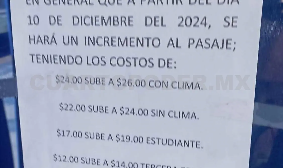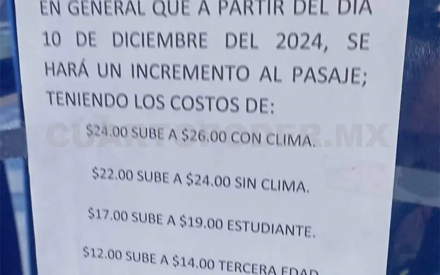 Así mismo tampoco se explicó la razón de dicho incremento al costo del pasaje, lo cual se ha convertido en una constante en los últimos años, apenas en en diciembre pasado también hubo un incremento de dos pesos, pasó de los 22 a los 24 pesos.