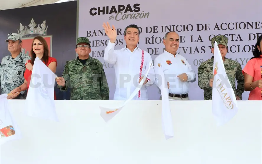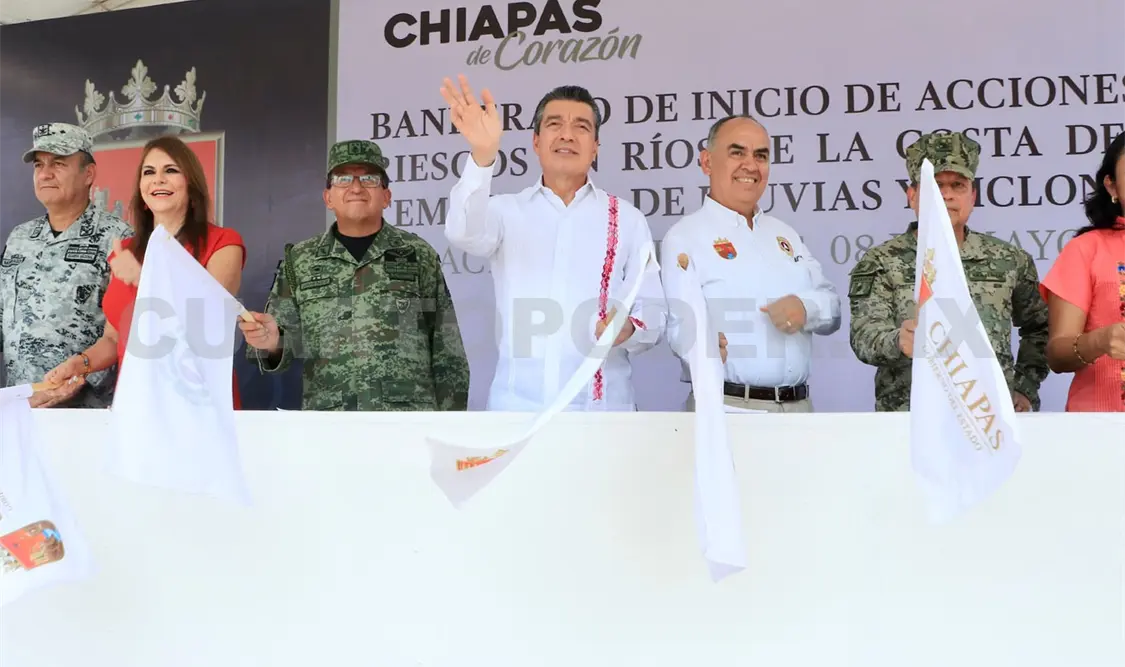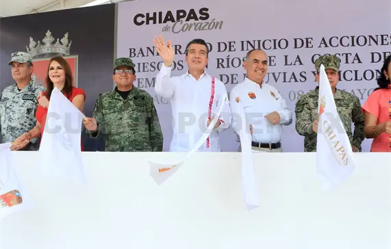 El gobernador Rutilio Escandón Cadenas inició las acciones de reducción de riesgos en ríos y afluentes de los municipios de Tapachula, Huixtla, Villa Comaltitlán y Escuintla, destacando la importancia de hacer causa común entre las autoridades federales, estatales y municipales para llevar a cabo este programa preventivo, cuyo objetivo es proteger el patrimonio, la integridad y la vida de la población durante la temporada de lluvias y ciclones.