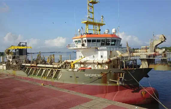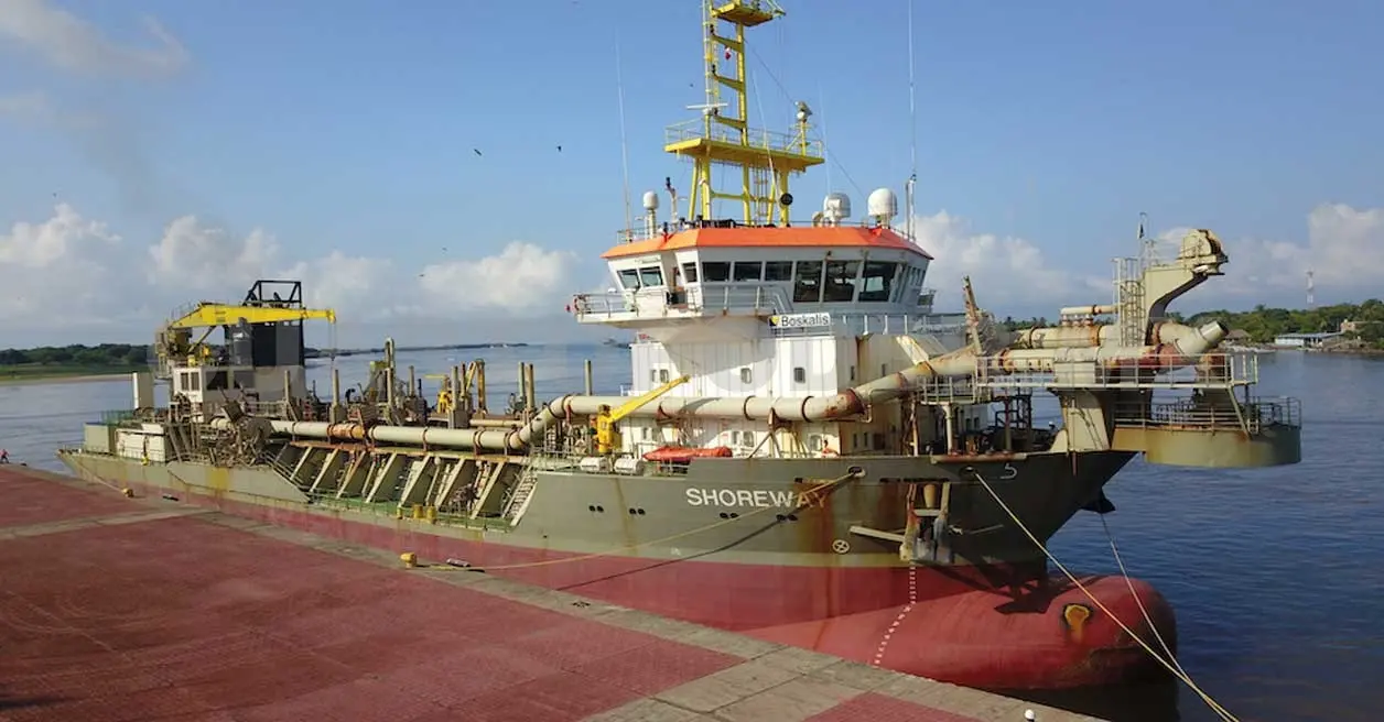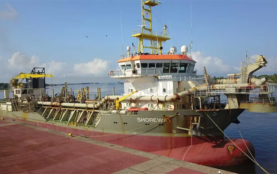 La draga Shoreway de 97.50 metros de eslora, 21.60 de manga y 5005 TRB de la empresa Boskalis Marine Contracting and Offshore Services, es la encargada de los trabajos de limpieza y ahondamiento de los canales de navegación.