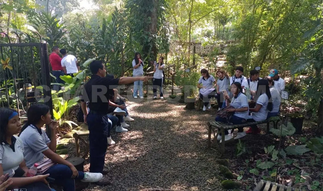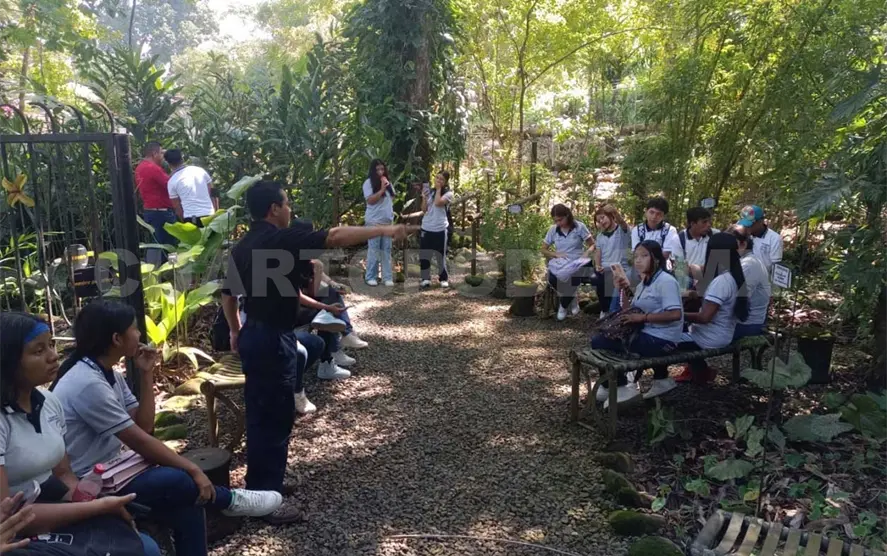 Estudiantes de la licenciatura de Ingeniero Agroforestal de la Universidad de Ciencias y Artes de Chiapas (Unicach), subsede Motozintla, beneficiarios del programa Pauta, y estudiantes de la escuela primaria Francisco I. Madero, finca El Portillo, del municipio de Tuzantán, visitaron el Jardín Botánico Regional del Soconusco.
