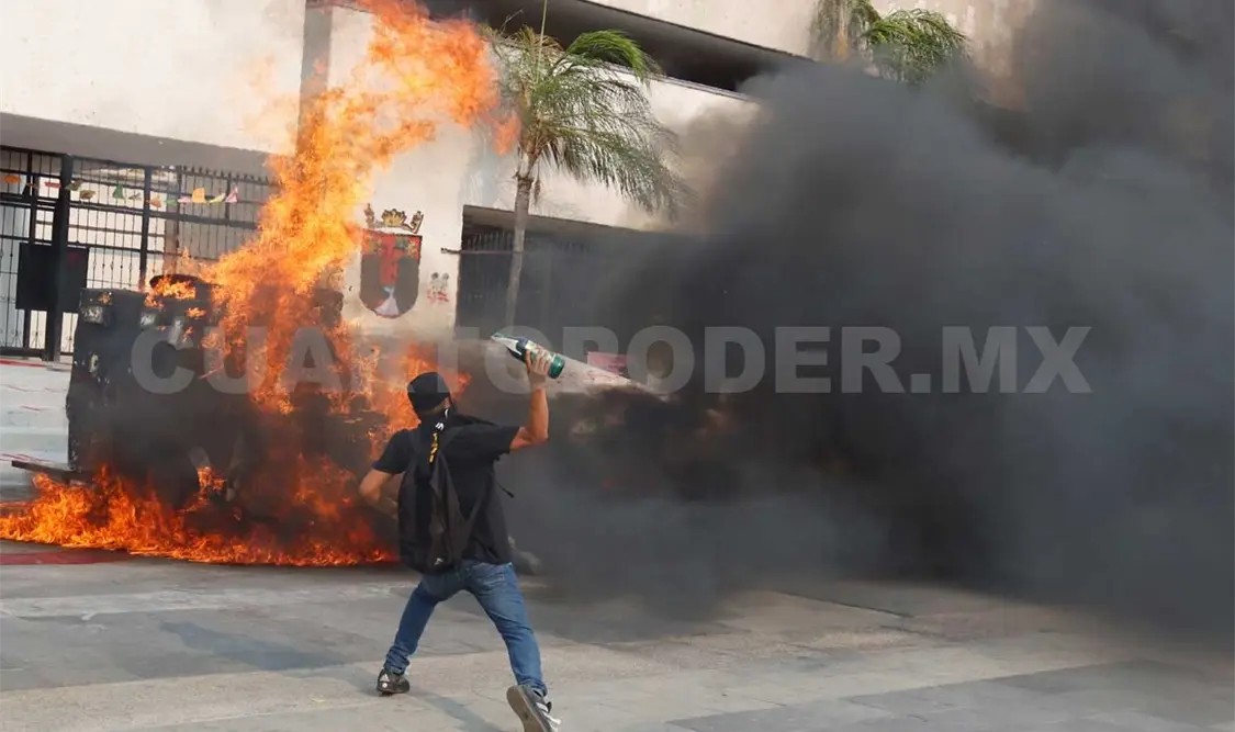 Momento previo al mediodía, el contingente estudiantil se presentó a las afueras de la Fiscalía General del Estado (FGE), en donde realizaron una serie de pintas rememorando la detención de 95 estudiantes el pasado 18 de mayo de 2021 que, de acuerdo con el reporte oficial, se trató de 74 mujeres y 21 hombres.