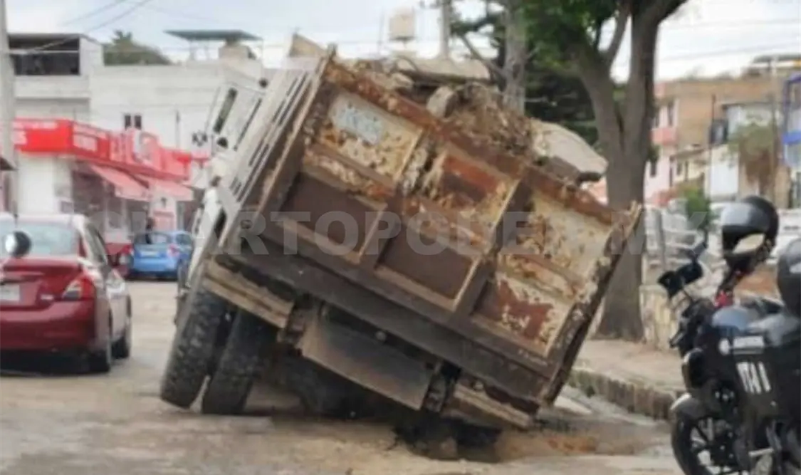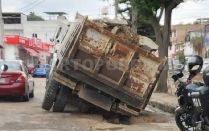 La pesada unidad circulaba con rumbo al norte, pero al pasar un bache la tierra se hundió y quedó atrapada la llanta trasera del lado derecho.