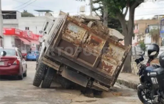 Un camión tipo volteo quedó atrapado en un bache la tarde de este martes sobre una transitada avenida en Comitán, siendo rescatado minutos después por una grúa. El tránsito vehicular fue tedioso y lento.