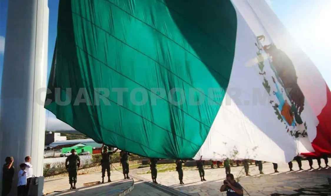 La bandera Monumental que ondea a lo alto de los campos militares en Chiapas, son fabricadas con tecnología de punta con telas Ripstop diamante, con nylon y reciben tratamiento repelente al agua para evitar que el peso y el ondeo que provoca el viento las rompa.