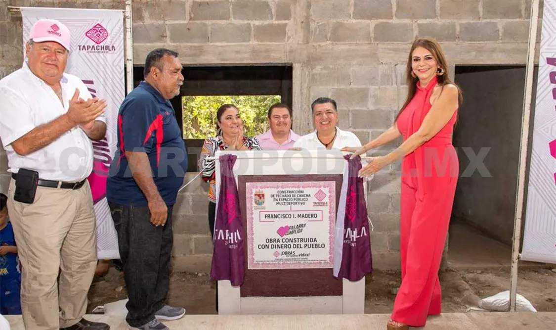 Acompañada de autoridades ejidales, cuerpo edilicio y habitantes del lugar, la presidenta municipal de Tapachula, Rosa Irene Urbina Castañeda, entregó el techado de espacio público en el ejido Francisco I. Madero, ubicado en la zona baja.
