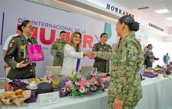 En el marco de la conmemoración del Día Internacional de la Mujer, y en las instalaciones del Campo Militar 31-C, la señora Sofía Espinoza dijo que la presidenta de México, Claudia Sheinbaum, es una mujer luchadora y que inspira a seguir en la preparación y en la lucha.