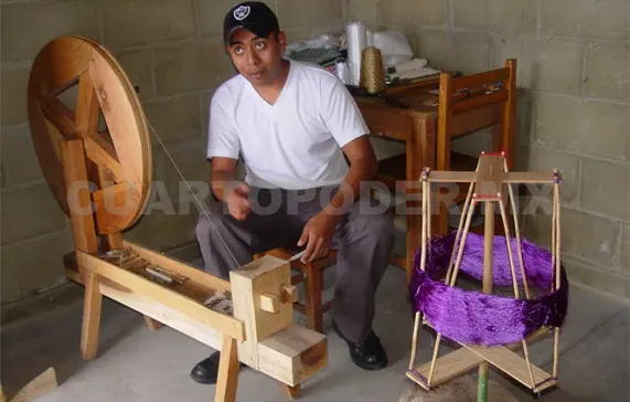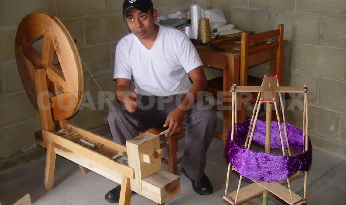 El joven artesano explica que atrás de un rebozo o una servilleta, hay un largo proceso que tarda días y días para preparar las madejas de hilo, teñirlas, urdirlas, plegarlas y montarlas en el telar, para comenzar a trabajar.