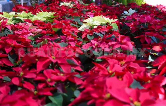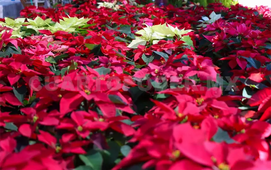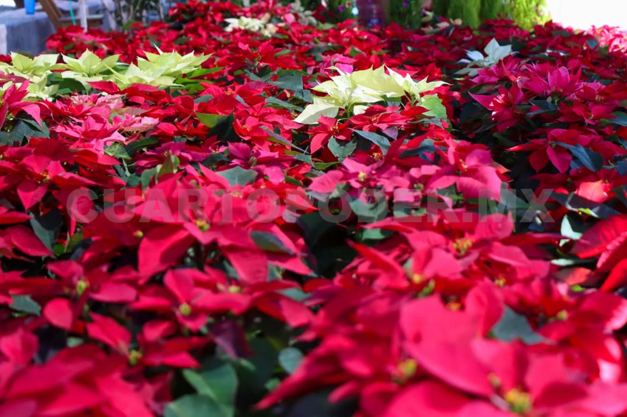 Bajo unas carpas que cubren a las plantas del sol, apiladas en filas resalta el color rojo de esta característica flor, sin embargo, también se aprecian tonalidades blancas, rosas y amarillas.