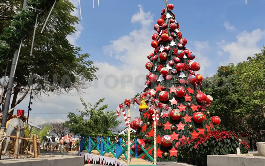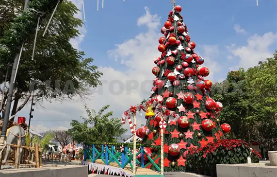 En el lugar sobresale un pino que es referente a la navidad, el cual está adornado con una estrella en la punta, esferas y arbolitos más pequeños, además de un camino que pasa a un costado.