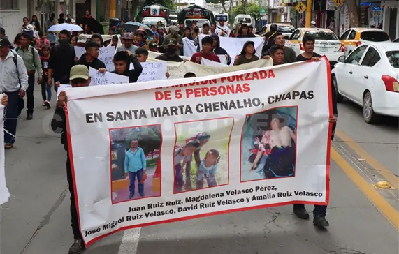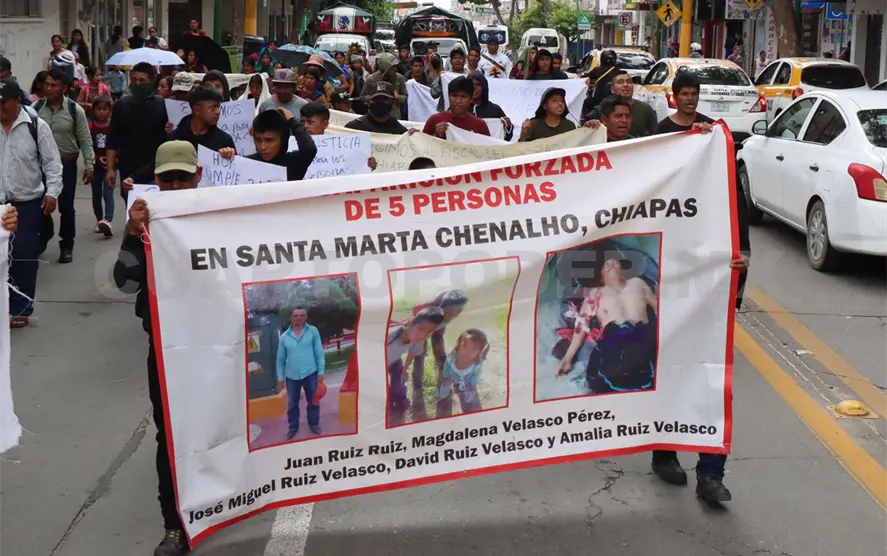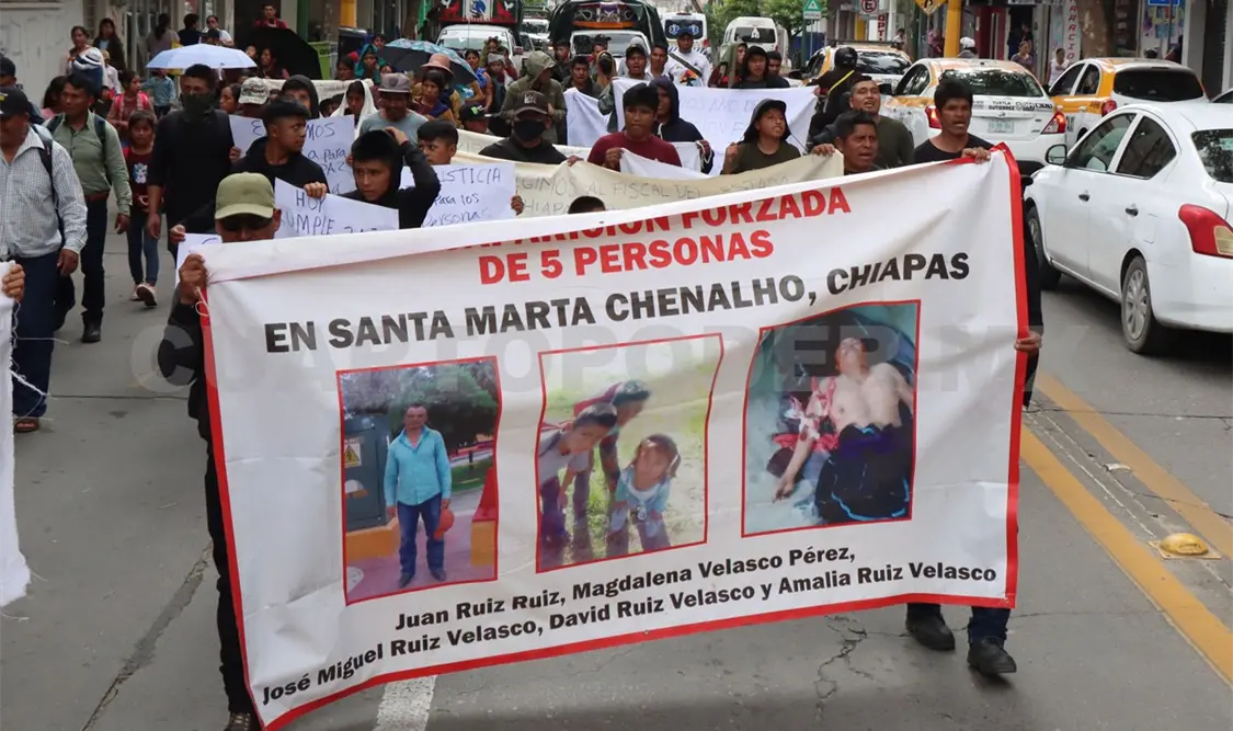 Cientos de personas desplazadas del sector Santa Martha, de San Pedro Chenalhó, realizaron una marcha para exigir justicia ante las afectaciones contra sus bienes e inmuebles y la presentación con vida de cinco personas desaparecidas.