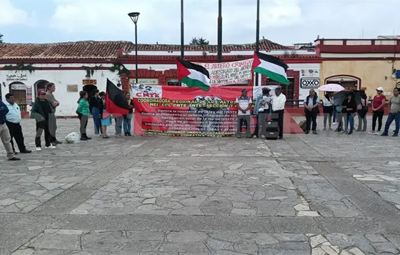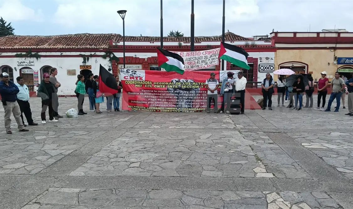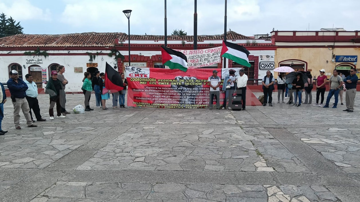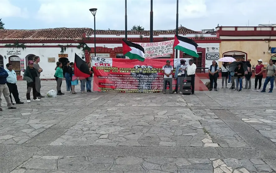 Integrantes de la Sección VII del Sindicato Nacional de Trabajadores de la Educación (SNTE), pertenecientes a la Coordinadora Nacional de Trabajadores de la Educación (CNTE), se manifestaron este domingo en la Plaza Catedral de San Cristóbal de Las Casas para recordar los 533 años “de la invasión de los españoles”.