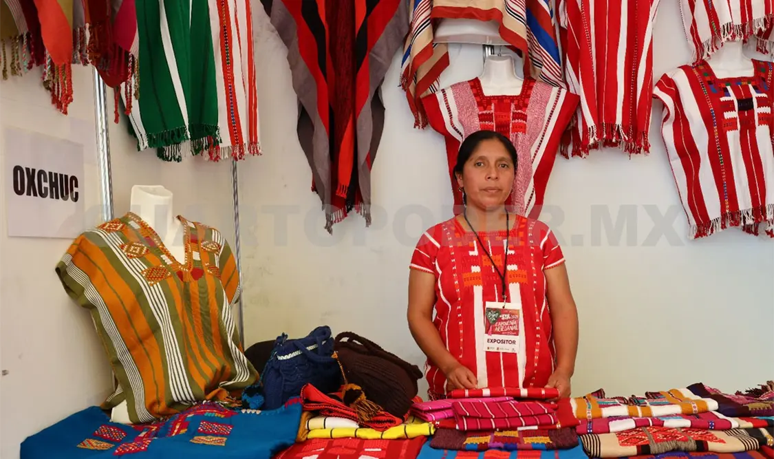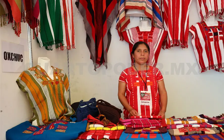 En medio de los múltiples puestos que ofrecen textiles, juguetes, productos a base de alfarería y hasta degustaciones en la expoventa artesanal “De mis manos a tu corazón”, aparece María Imelda López Morales, una artesana de Oxchuc que aprendió el oficio desde muy pequeña.
