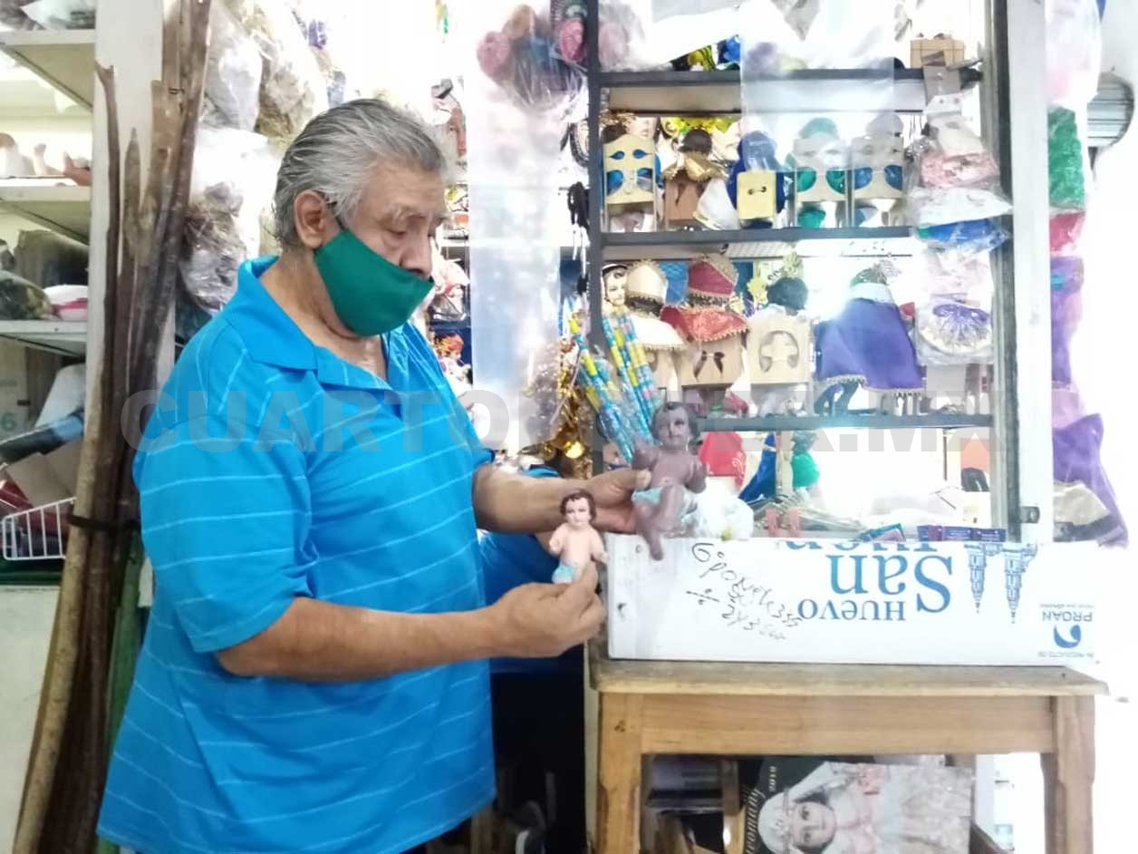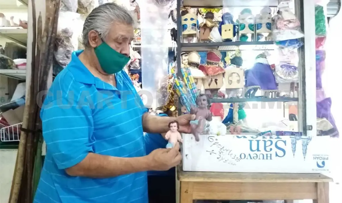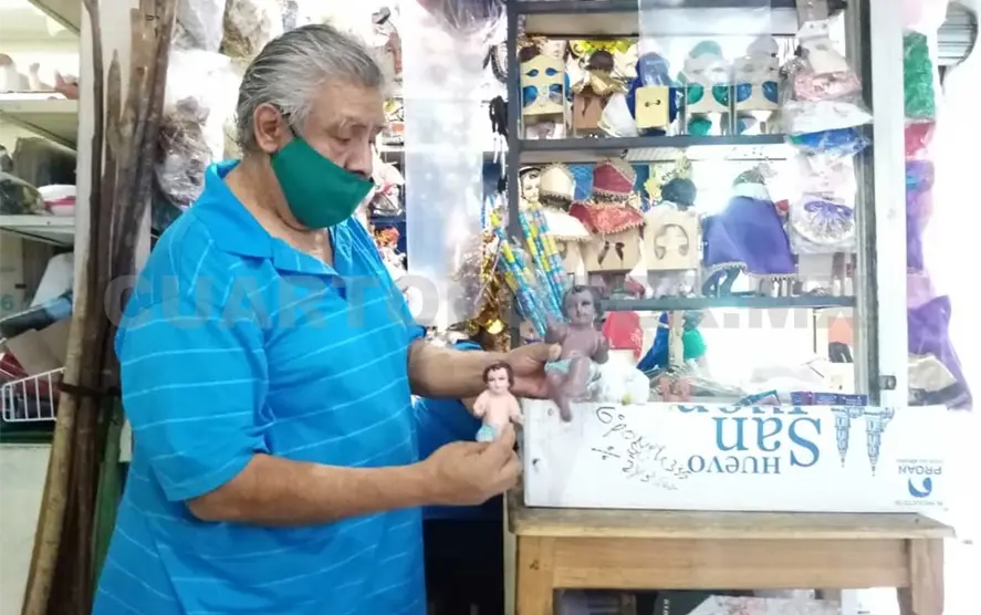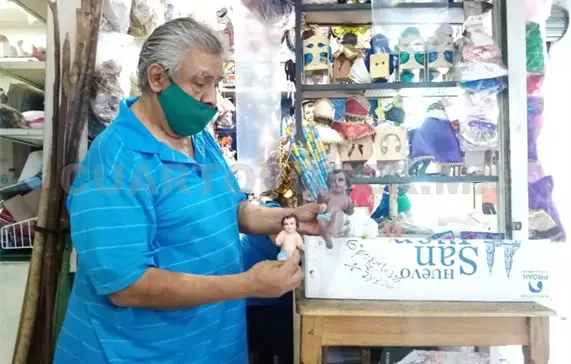 Raymundo García acumula más de 20 años reparando imágenes religiosas en el interior del mercado Rafael Pascacio Gamboa, en donde cuenta con un pequeño local mediante el cual comercializa imágenes, ropa y adornos religiosos.