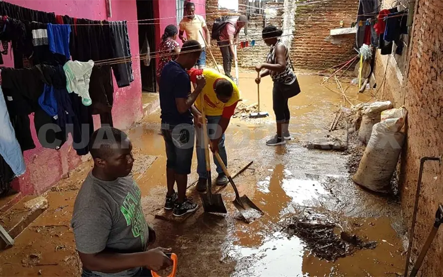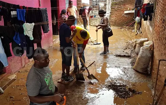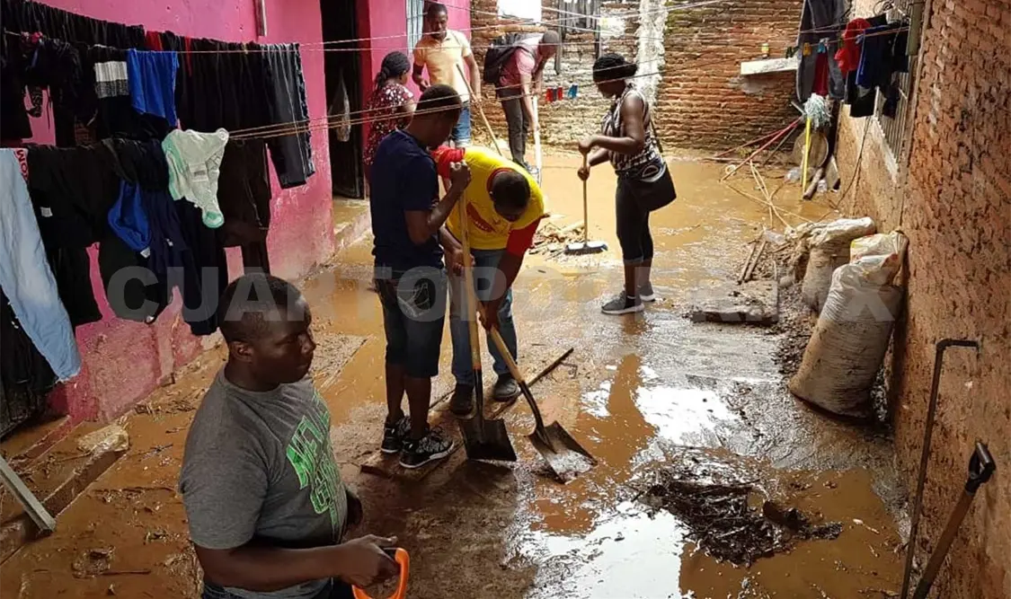 Luego de las fuertes lluvias del lunes, ayer por la mañana en la colonia Campestre-Corlay, personal de Protección Civil del Ayuntamiento y del Gobierno del Estado fueron acompañados por cuadrillas de migrantes extracontinentales y centroamericanos que realizaron trabajos de limpieza de calles, viviendas y ayuda a la población, como parte de un programa de emergencia social.