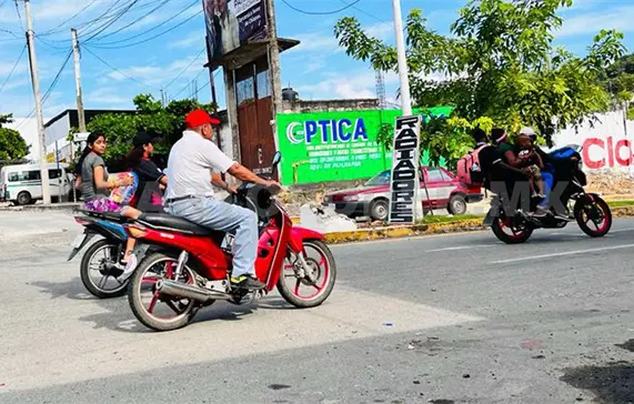 A todas horas del día, migrantes usan las motocicletas para burlar los puestos de revisión migratoria establecidos sobre la vía federal, viajando además sin ninguna protección e incluso se trasladan más personas de lo permitido para estas unidades (dos personas).