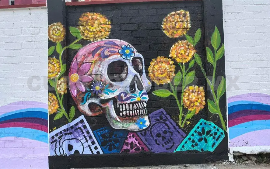 Diversos murales representativos del Día de Muertos lucen en las bardas del Panteón Municipal de San Cristóbal de Las Casas.