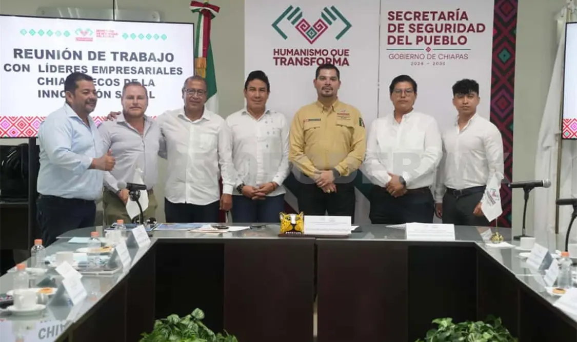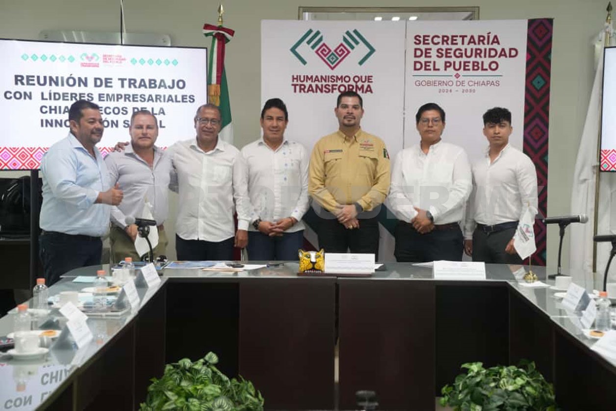 Para reforzar alianzas estratégicas y continuar estableciendo acciones conjuntas que contribuyan al fortalecimiento de la estrategia de seguridad en Chiapas, el secretario de Seguridad del Pueblo, Óscar Alberto Aparicio Avendaño, junto al coordinador general de Administración y Finanzas, Hugo Alejandro Zúñiga Román, sostuvo una reunión de trabajo con Empresarios chiapanecos de la Innovación Social A.C.