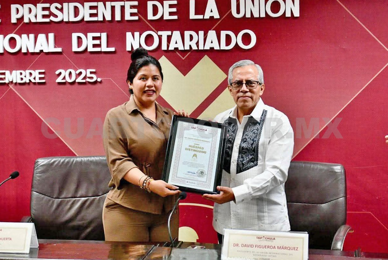 El Ayuntamiento de Tapachula nombró “Huésped Distinguido” y entregó las llaves de la ciudad, al presidente de la Unión Internacional del Notariado, Dr. David Figueroa Márquez, por su trayectoria, méritos y aportes jurídicos y humanistas. Con la representación del alcalde, Yamil Melgar Bravo, la síndico municipal, Cleo Ortiz Huerta, destacó que la trayectoria de Figueroa Márquez ha sido fundamental para promover la actualización jurídica, la digitalización de procesos y la cooperación global en beneficio de las instituciones y de los ciudadanos.
