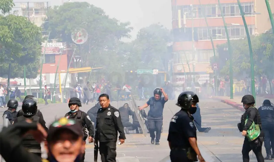 Posteriormente, los elementos policiacos lanzaron gas lacrimógeno desde la azotea del Palacio de Gobierno y salieron a confrontar a los manifestantes que se reagruparon en la explanada central.