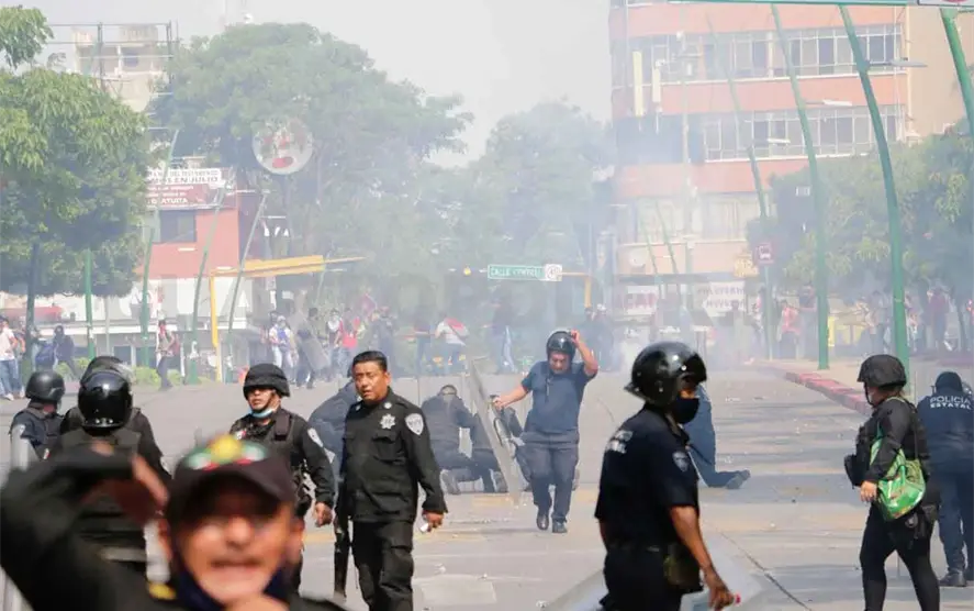 En este espacio, los normalistas comenzaron el choque contra los elementos del grupo antimotín que avanzaron sobre la avenida Central lanzado cohetones y bombas fabricadas.