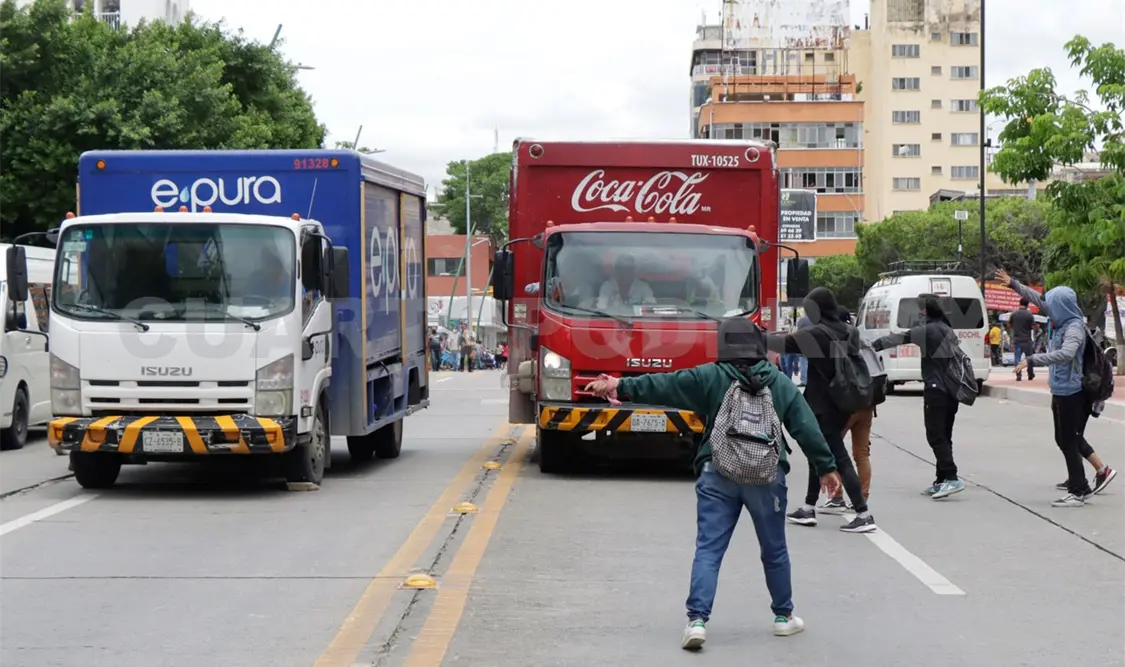 En estas acciones los normalistas retuvieron dos camiones, uno de una empresa refresquera y otro usado para repartir agua embotellada. En un acto radical, uno de estos camiones fue lanzado contra la barricada de metal que está colocada para proteger la entrada y salida trasera del Palacio de Gobierno.