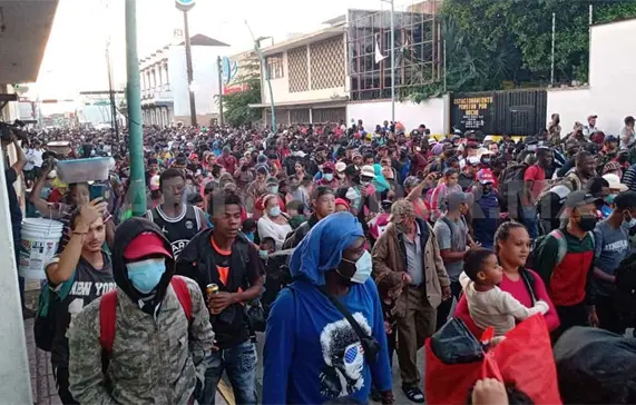 Este jueves partieron del parque Bicentenario, en el centro de Tapachula y tras cruzar el puesto de control migratorio de Viva México, continuaron la caminata hasta la población de Huehuetán, en donde hacen su primera parada.