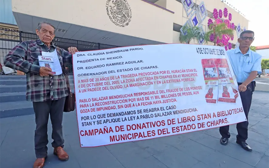 Así lo expuso Carlos Tapia Ramírez, presidente del Consejo Regional de Damnificados de Stan y también presidente de la Sociedad Civil del Soconusco al fijar un posicionamiento dirigido a la presidenta de la República, Claudia Sheinbaum, desde el parque central de la capital de Chiapas.