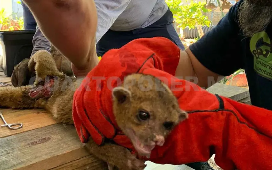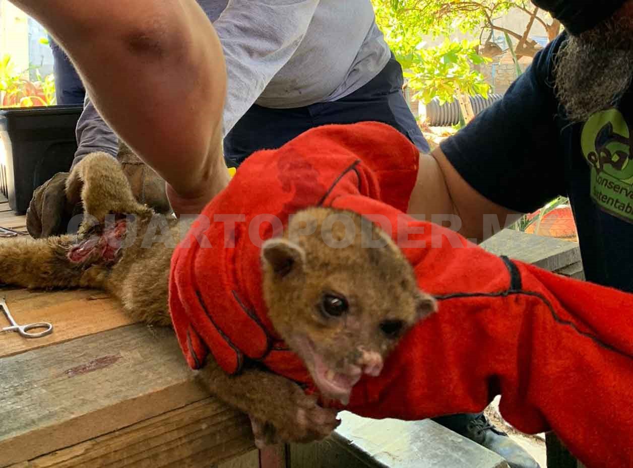 Una martucha o mico de noche (Potos flavus) severamente herido fue rescatado por obreros que laboran en la ampliación de la vía Tuxtla Gutiérrez a San Cristóbal de Las Casas. De manera voluntaria el mamífero fue entregado en la estación oriente del Heroico Cuerpo de Bomberos.