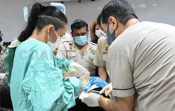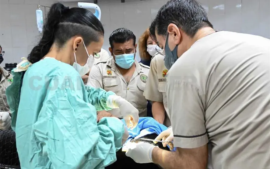 Varela Falcón detalló que la cirugía llevó alrededor de una hora. En estas actividades participó el cuerpo médico que está integrado por siete personas, desde quienes estaban en la sala de operaciones hasta los que apoyaron en su traslado a la jaula.
