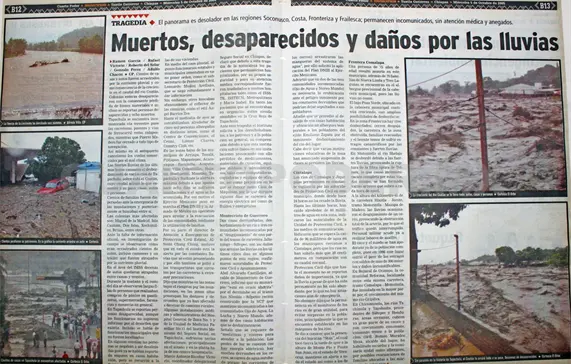 Cientos de casas y autos fueron arrastrados por la corriente pluvial como consecuencia de la creciente en el caudal del río Coatán. Colonias enteras desaparecieron con la consecuente pérdida de bienes materiales e incluso, se reportan personas desaparecidas y ocho muertos.